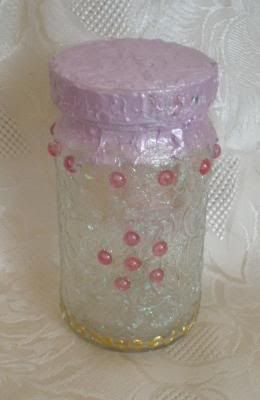 Hier habe ich ein Glas mit Glascreme gestaltet und mit Modeliercreme den Deckel verschönert.