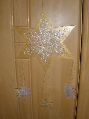Aus Folie Sterne ausgeschnitten und mit goldener Satinierfarbe, Glascreme (hologramm), Kreativfarbe und Eiskristall bearbeitet.